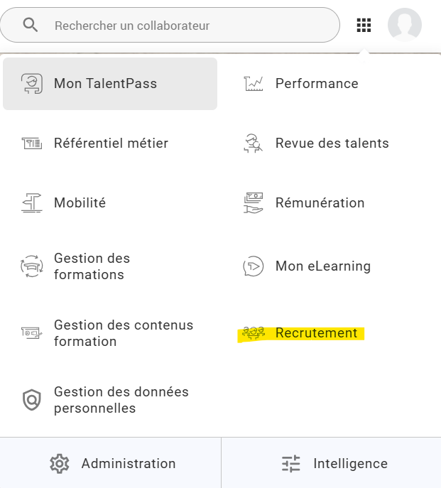 Via TalentPass : connectez-vous à TalentPass puis sélectionnez Recrutement dans la liste des applications disponibles dans le Menu Gauffre (voir screenshot ci-dessous).