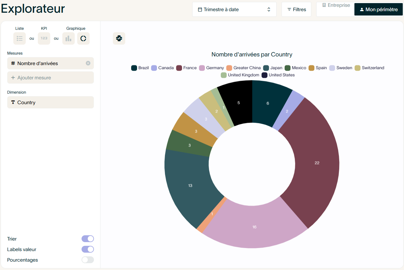 Le graphique ci-dessus illustre le nombre d’arrivées par pays sur la période Trimestre à date. Il s’agit d’un diagramme en anneau, qui permet de comparer la répartition des arrivées entre différents pays.